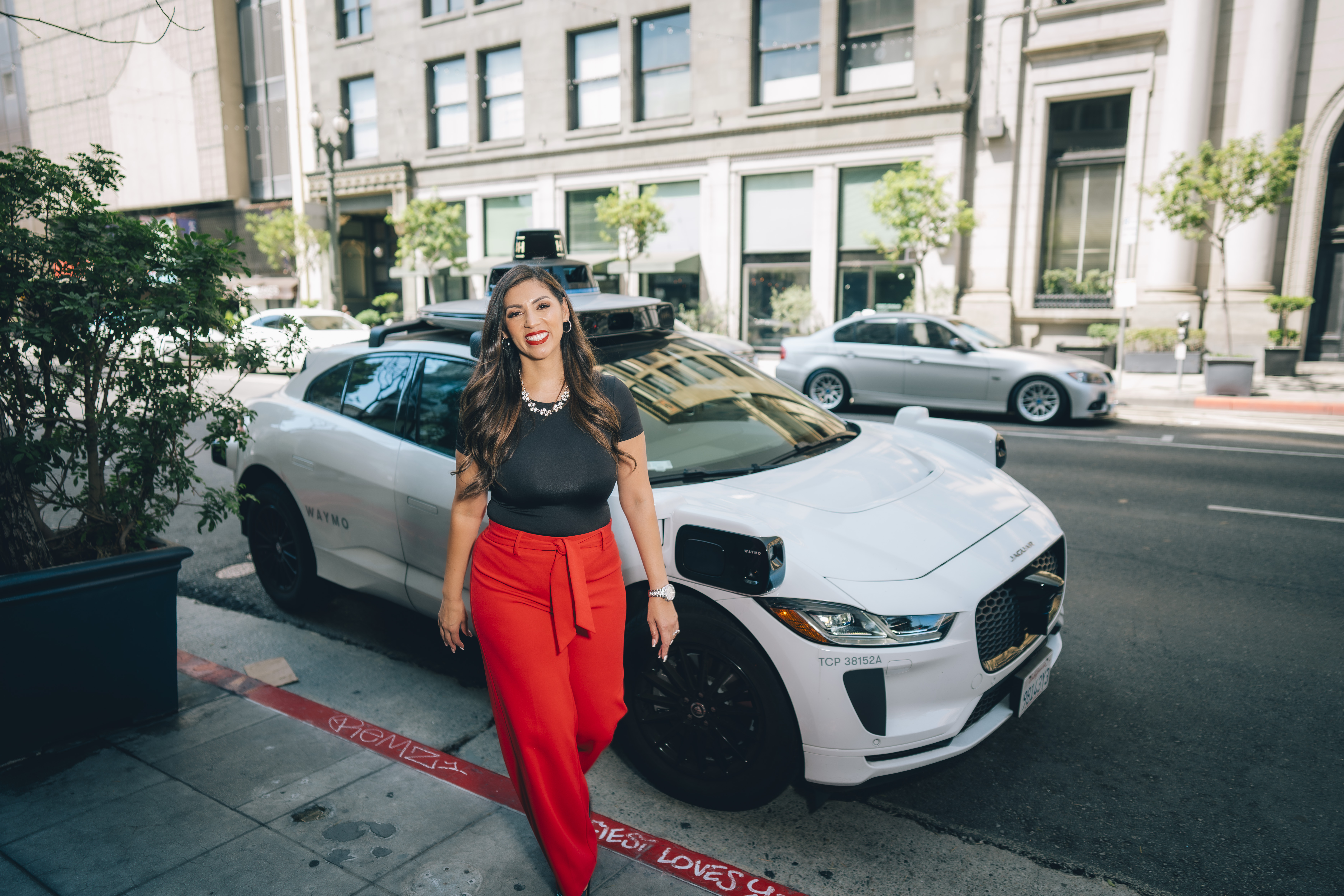 Lori and Lili, in Los Angeles, about to enter a Waymo autonomous vehicle
