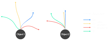 As in the above simple example for joint predictions on two agents, the white arrows are ground truth trajectories, and the colored arrows are predicted trajectories with confidence scores while the trajectories of the same color are paired. For object 1 and object 2, only the blue trajectory is within the given lateral and longitudinal threshold compared to the ground truth. The precision and recall based on sorting the confidence stores can be computed as: